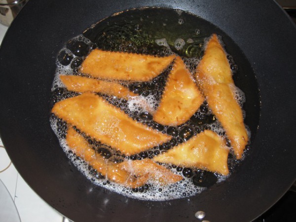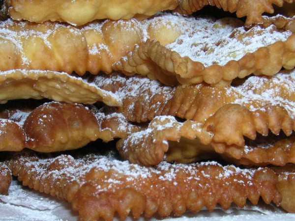Sul piano da lavoro, mettetevi la farina insieme alle uova, al burro tenuto a temperatura ambiente da qualche ora, un pizzico di sale fino ad ottenere un composto omogeneo. Lasciate riposare per circa mezz’ora. Dopo, stendete l’impasto col mattarello, formate dei rombi e dei rettangoli e friggeteli in padella con l’olio bollente. Scolatele e asciugatele con carta assorbente. Quando si saranno raffreddati potete cospargerli con lo zucchero a velo.
