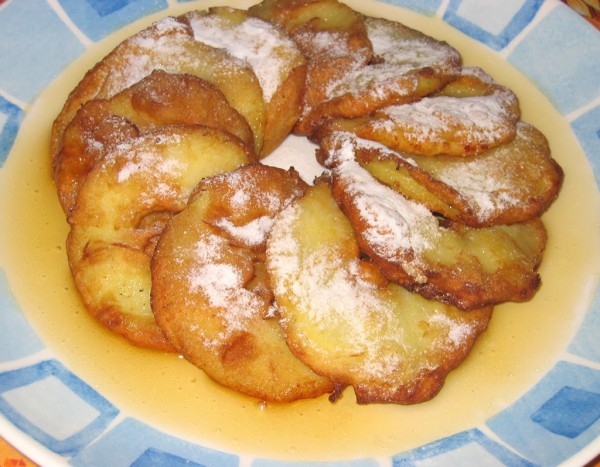 In una ciotola sbattete i tuorli con il latte, la farina, la vanillina e un pizzico di sale. Mettete l’impasto a riposo per mezz’ora. Montate a neve gli albumi e aggiungeteli al composto. Continuate a lavorare l’impasto e passate le fettine di mele nella pastella, poi friggetele. Asciugatele su carta da cucina e spolverizzatele con lo zucchero a velo.