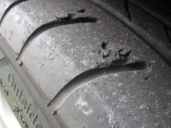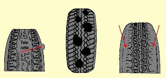 Le gomme vecchie di età presenteranno numerose screpolature, tagli, fenditure, sia sul battistrada che sulla fiancata ed anche queste in frenata non renderanno per niente.