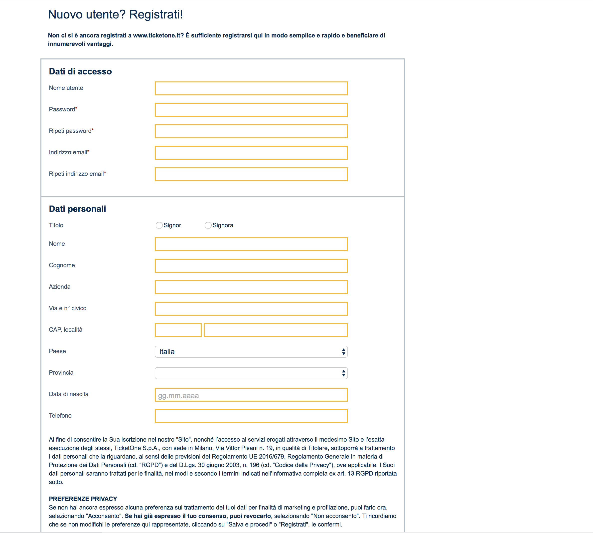 Registrazione su Ticket One
